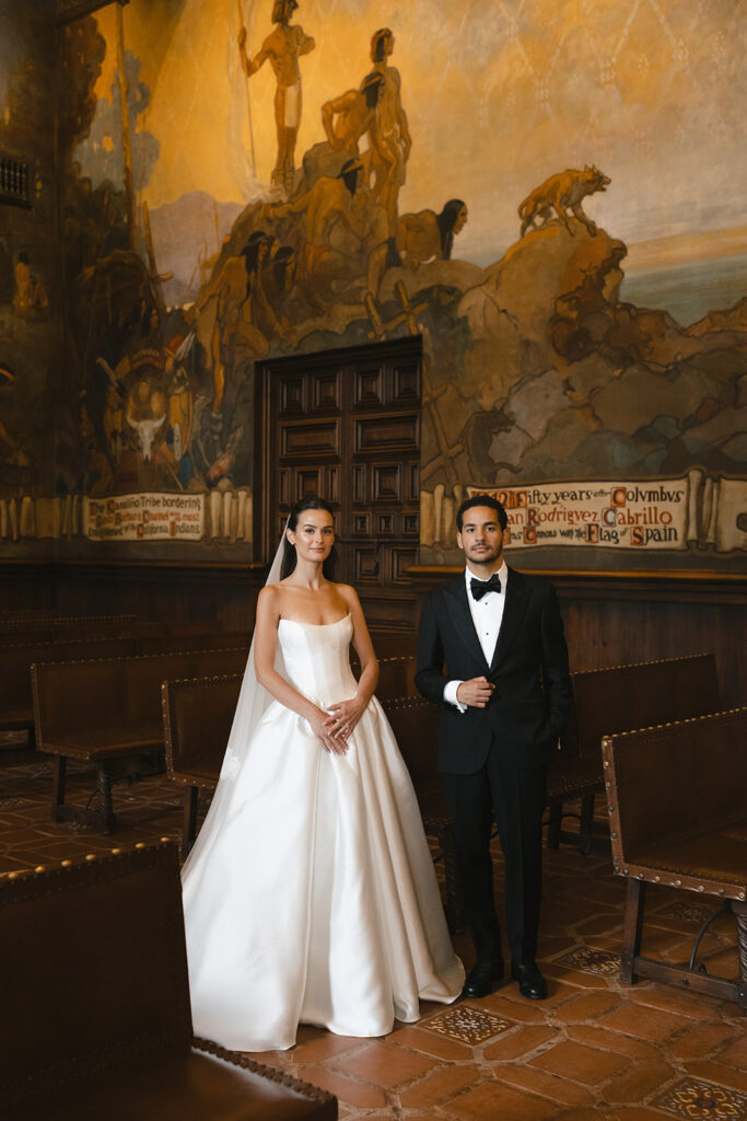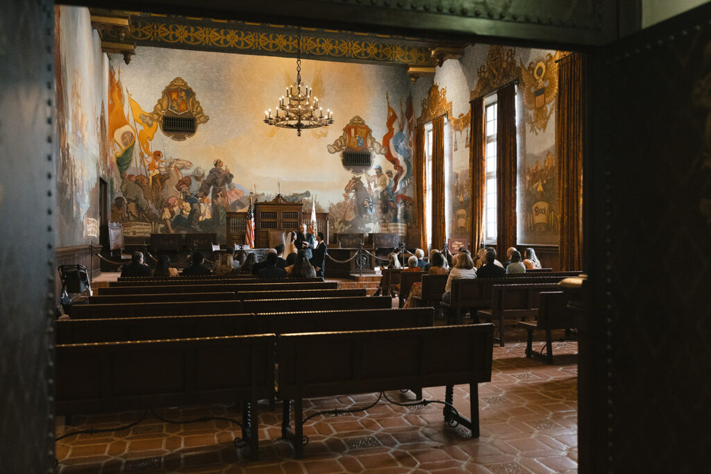 Originally built as the Board of Supervisors’ Assembly Room, the Mural Room is a dramatic, 4,100-square-foot indoor space covered floor-to-ceiling in rich, hand-painted murals that depict key moments in Santa Barbara’s history. It gives off serious 1928 courthouse energy— very moody, ornate, and theatrical. It’s definitely a vibe, and a completely different experience than tying the knot outdoors in the Sunken Gardens.